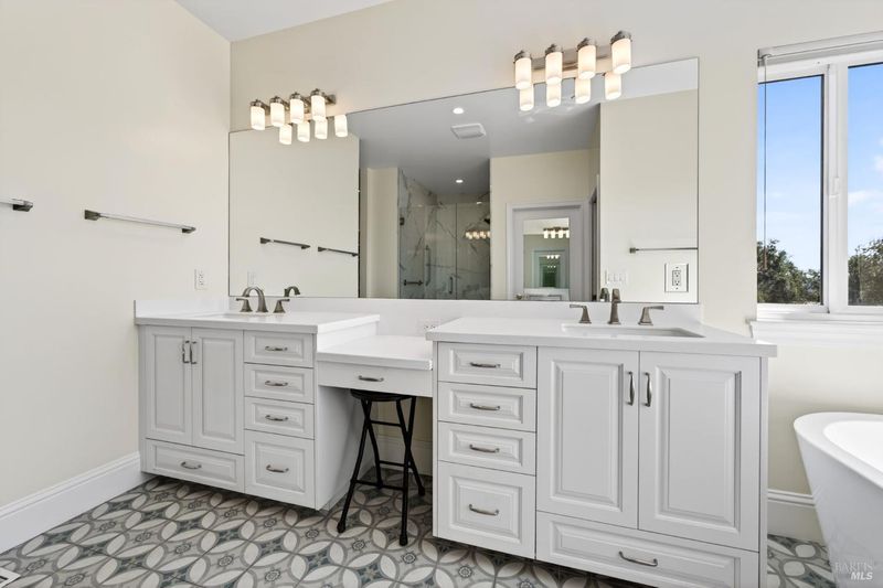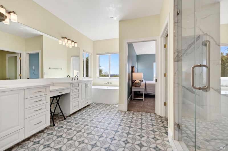 - Double Sinks, Shower Stall(s), Soaking Tub, Walk-In Closet