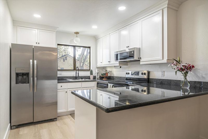 - 220 Volt Outlet, Countertop - Granite, Dishwasher, Garbage Disposal, Microwave, Exhaust Fan, Oven Range - Electric, Cooktop - Electric, Refrigerator