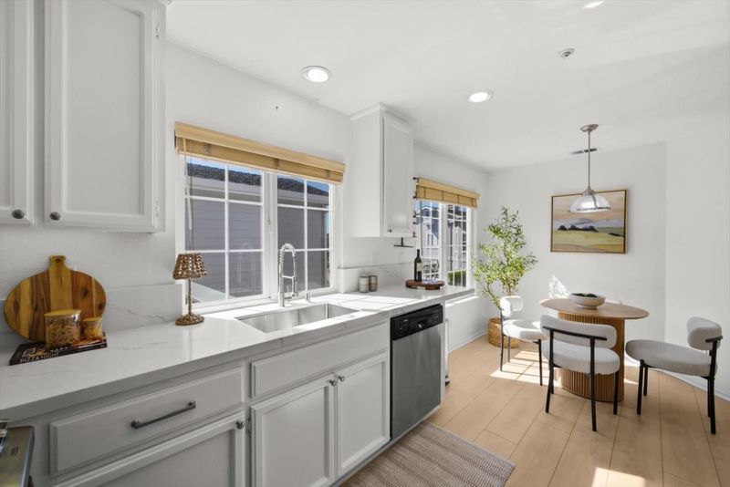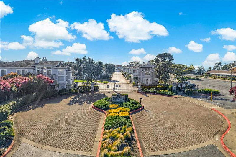 Perched on the top floor within the exclusive gated community of Mariners Pointe, this rare 3-bedroom residence offers a refined coastal lifestyle with privacy, light, and sweeping views. Approx.1,467 sqft, the home is defined by soaring ceilings and an abundance of natural light that pours into the expansive living space. Framed by tranquil mountain vistas, the living room creates a warm, sophisticated setting, complete with a wood-burning fireplace for cozy evenings. The dining area flows seamlessly for intimate dinners & gatherings.The kitchen features updated countertops, stainless steel appliances, and generous cabinetry. Vaulted ceilings and captivating mountain and ocean views create a sense of escape within the main suite. A spacious walk-in closet and spa-inspired ensuite bath with dual vanities, soaking tub, and extended storage. Additional bedrooms offer flexibility for guests, a home office, or a growing household. Highlights include in-unit laundry, central heating, two private garages plus nearby guest parking. Mariners Pointe delivers a resort-like lifestyle with scenic walking trails, clubhouse for large parties, fitness center, hot tub, and playground. Mere mins from San Francisco, Pacifica beaches, coastal trails, local shops, dining, public transit & SFO.