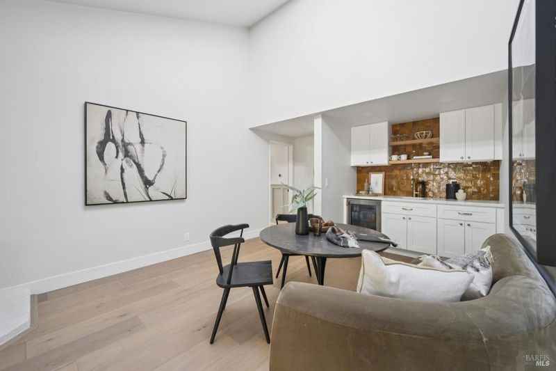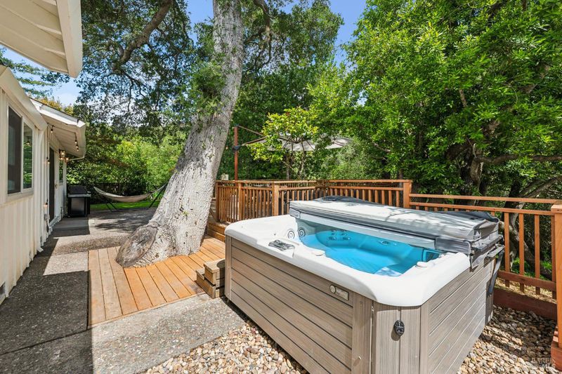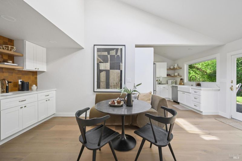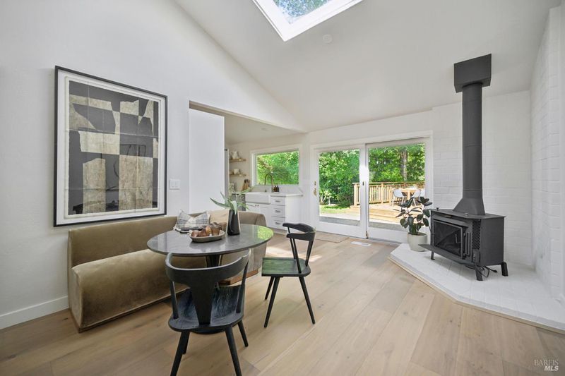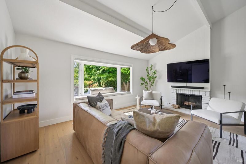 Originally a classic 1960s home on a quiet cul-de-sac in Upper Lucas Valley, this house has been thoroughly renovated over the past five years. The work is thoughtful, with design choices that hold up to daily life. The interior is anchored by wide-plank white oak floors that carry through the main level, vaulted ceilings in the living spaces, and a warm color palette. The living room centers on a wood-burning fireplace framed in painted brick. A wood stove in the adjacent family room gives the back half of the house its own focal point. The two spaces connect naturally but feel distinct. The kitchen, newly completed in 2026, pairs white shaker cabinetry with a full-height marble slab backsplash, open oak shelving, and a double oven range. Just around the corner, a separate bar area with its own sink, beverage fridge, and a Zellige copper-glazed tile backsplash that is genuinely one of the best details in the house. The primary suite is vaulted and generous, opening to the back deck through sliding glass doors. The bathroom has a curbless shower tiled floor-to-ceiling in deep green, heated floors, and a double walnut vanity with California Closets built-ins. The guest bedroom offers a built-in reading nook under a skylight, and the nursery carries soft blush walls with shiplap wainscoting. Each room has its own character that beautifully complement one another. Outside, a large redwood deck wraps around a 300-year-old oak tree. There is a hot tub, a hammock, a lawn, and an orchard's worth of fruit trees: lemon, lime, orange, fig, peach, nectarine, and apricot. Pickleball and tennis courts are at the end of the street. Miller Creek School is within walking distance. The hills are right there for hiking. 14 Mount Wittenburg Court is move-in ready, with nothing left to do but make yourself at home.