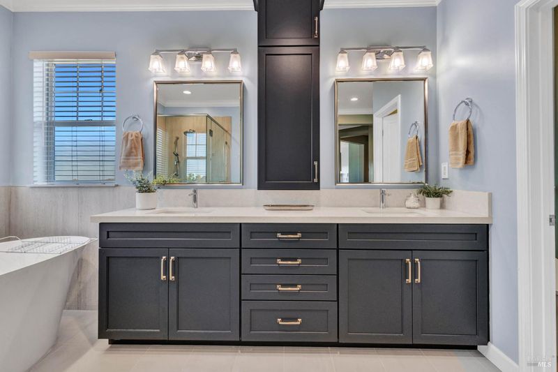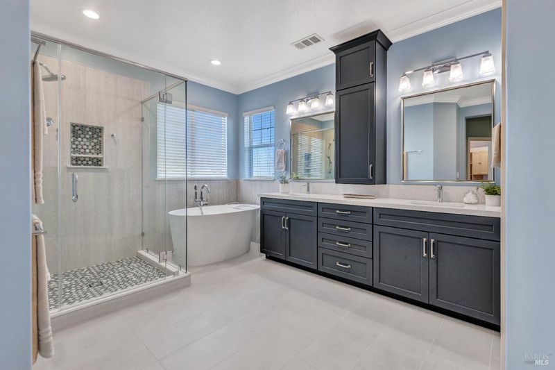 - Double Sinks, Shower Stall(s), Soaking Tub, Walk-In Closet