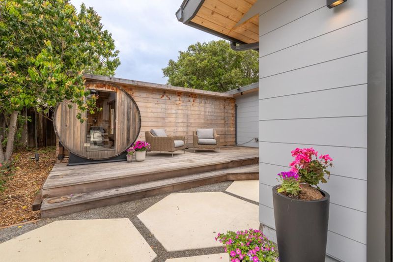 Carmel, an exceptional high end modern designer retreat fully reimagined inside and out set on a private, lush 1/3acre just minutes from beaches, shops, and dining. This rare single level 3BD/2.5BA home offers 2,142± square feet of refined coastal living with owned solar and resort style grounds. Striking yet inviting interiors blend contemporary architecture with warmth and livability, featuring custom cabinetry, soapstone countertops, quartz baths, a wood burning fireplace, and a chefs kitchen with premium appliances, Bosch induction cooktop, and double ovens designed for everyday comfort and entertaining. Comprehensively upgraded throughout with new electrical, plumbing, insulation, subfloor, drywall, and a 5zone minisplit HVAC system. Energy efficiency is enhanced by an owned 10.44 kW solar system (NEM 2.0) and Tesla EV charger. The grounds offer a true private sanctuary with lush landscaping, mature fruit trees, new decks and patios, and thoughtfully designed outdoor living spaces. A barrel sauna and hot tub create a spa like experience at home.