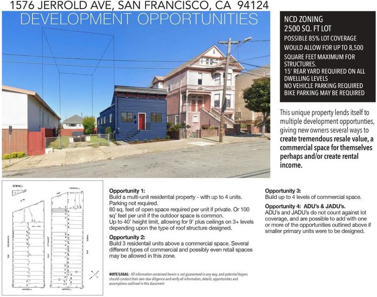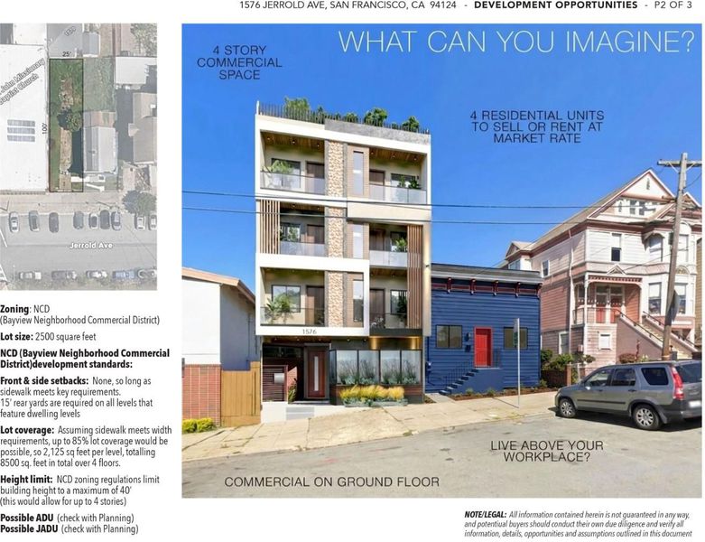 1574 and 1576 Jerrold Ave are being sold together as one purchase and include two separate parcels with individual APNs. The property consists of a move-in-ready single-family home and an adjacent vacant lot, offering a combined approximately 4,995 sq ft of land. The residence at 1574 Jerrold Ave is a 3-bedroom, 1-bath home with approximately 1,125 sq ft of living space. The home has been updated with new flooring and appliances and Section 1 clearance is scheduled to be completed. The property retains classic San Francisco character while providing comfortable living space. The adjacent parcel at 1576 Jerrold Ave is a vacant lot included in the sale. The additional parcel provides potential options for expansion, additional parking, or future development possibilities. Located in San Franciscos Bayview District with access to transportation, local amenities, and major roadways. Buyer to independently verify zoning, development potential, and all building possibilities with the City of San Francisco.
